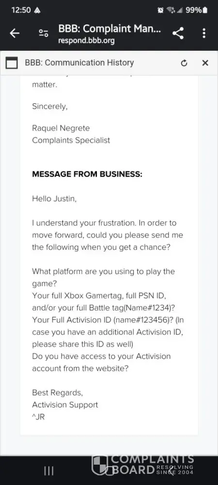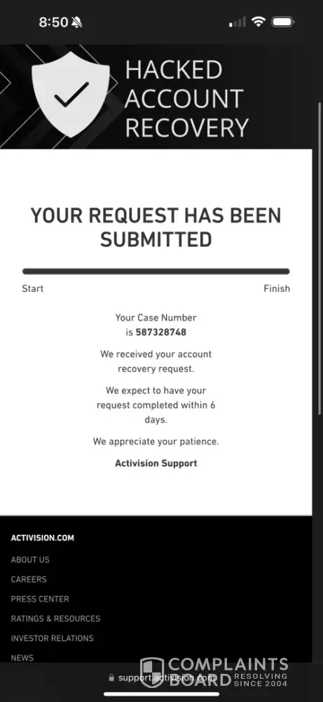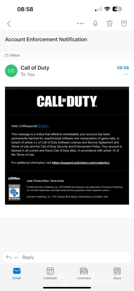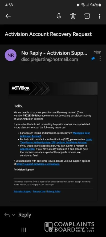 I have been playing Call of Duty for over a decade with the same Activision account, purchasing the new CoD every year. I have never hacked or used any cheats in my life. Activision states that ‘Bans will only be overturned if we determine the infraction was due to unauthorized activity on your Activision account.’ Someone gained access (hacked) into my Activision account and linked their Steam account to it, which resulted in my account getting permanently banned. I appealed my ban but was denied only a couple hours later with a generic response. I submitted proof to Activision, through the Better Business Bureau, showing someone hacked into my account. I also submitted a complaint through the California Attorney General. However, Activision has failed to look into the matter and have been unresponsive for a couple weeks.