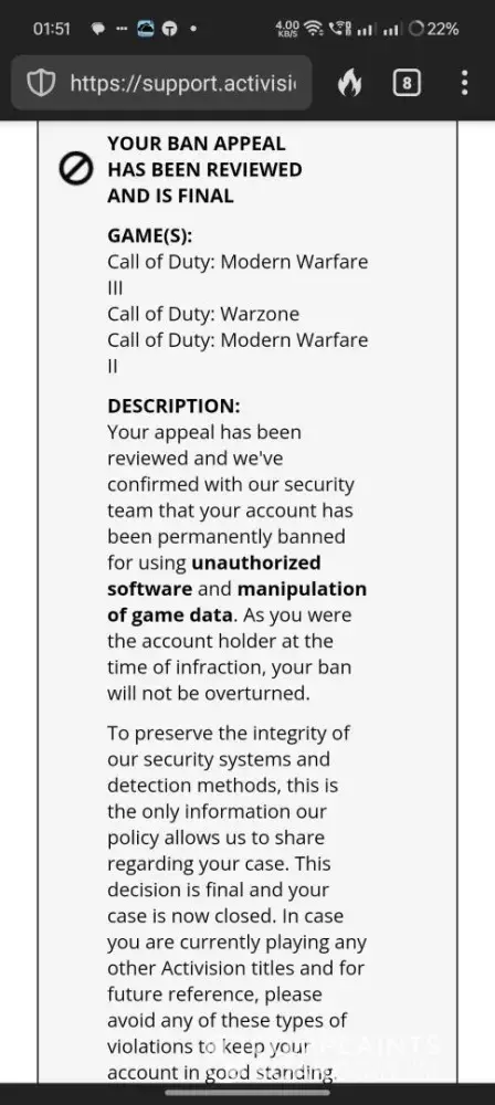 It happened on June 7th 2024. I was planning to play some call of duty modern Warfare 3, well I was about to, when all of a sudden I got a message saying that I was temporarily banned on the call od duty loading screen, made me wondered what I did wrong. So I went to Activision website and appealed for ban over there, after reviewing it, it got denied and it said that I'm permanently banned from playing call of duty and they won't overturn the ban. The reason they gave that I using unauthorised software and manipulating the game data. To be more specific I'm a console player and it's impossible to use random software on my console, I tried contacting activision customer support but nothing works. It just made me more frustrated, makes me think that activision is not willing to help. I hope they do smth about it.