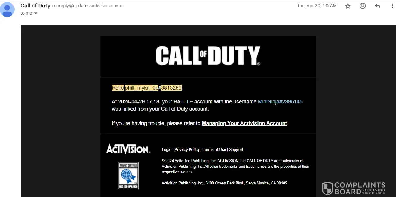 It all started around 4am uk time when I woke up and saw an email that said Hello phill_mykn_0b#3813295, At 2024-04-29 17:18, your battle account with the username minininja#2395145 was linked from your call of duty account. This email came through at Apr 30, 2024, 1:12 am I didnt see this til around 4. When I saw it I went on and saw they played...