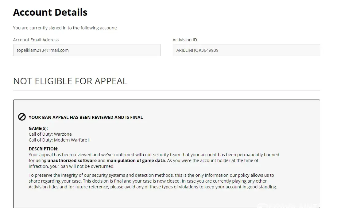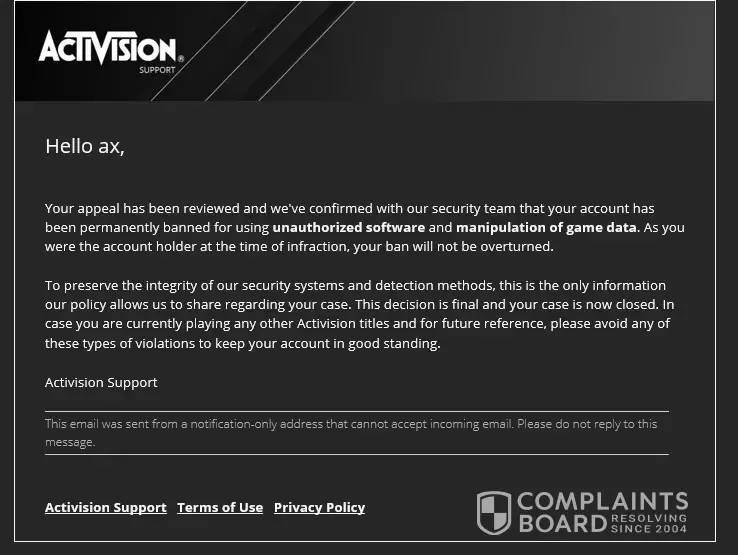 I'm reaching out to you in the hope that someone can help me recover/unban my activision account. As you can see from this trail, I have been receiving automated messages from Activision since the 27th august regarding this and I'm concerned that this has just fallen by the wayside. I have also had contact from Activision to inform me my account is permanently banned, which has stated I have allegedly used unauthorized software and manipulation of game data.
