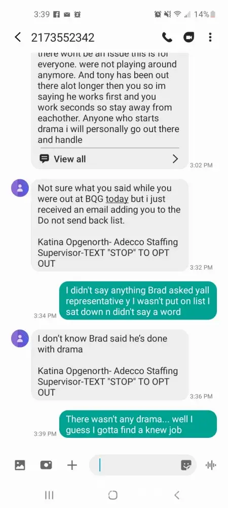 I still have NO direct response from Adecco, just one from the unemployment agency. I will now be seeking legal council, to remedy this situation. I worked 40+ hours a week, and I am still owed over $600+ of back pay. Again, they have not responded to me at all... But responded to the unemployment investigator, and lied...