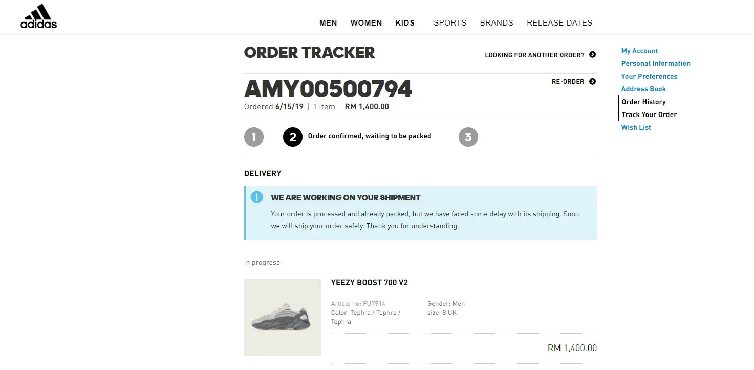 I purchased a pair of YEEZY BOOST 700 V2 "Tephra" FU7914 from ADIDAS MY online website on last year June/15th/19, with order number AMY00500794. Unfortunately the pairs didn't deliver until today and the status are still tucked on "Order confirmed, waiting to be packed". I contacted the customer service via email and also online chatting several times and the answer are still them same, waiting advice from warehouse. Im really disappointed and fedup with their service, this is consider a scam already for me, took your money almost a year and didn't deliver anything to you. I made a request on refund or replace with any other Yeezy shoes but until now they didn't give any response to me, I'm going to seek for legal advice for upcoming day and I hope complaint board could help me on this issue, thank you.