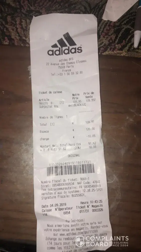 On 28/10/2019 I bought football shoes at the Adidas outlet store in Designer Outlet Parndorf in Vienna. To the cashier, I brought a box with shoes with a price tag of 34.95 euros. I paid for the product with a card and because I was in a lot of a hurry I didn't pay attention to the bill, thinking everything was okay.