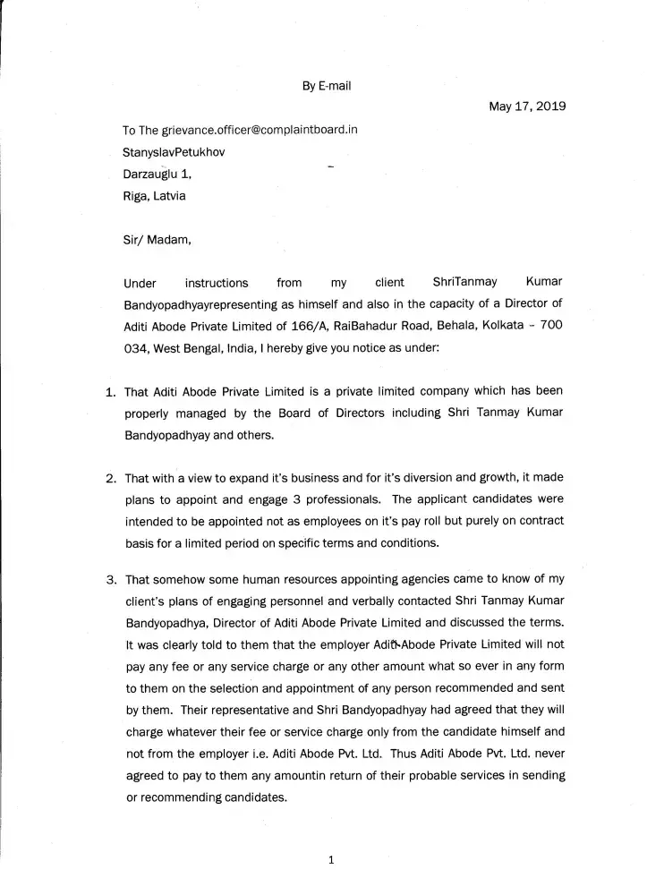 Suddenly aditi abode private limited stated hire candidate from us. We accepted their proposal and started to send the resumes and candidates to this company against their vacancies of cement segment and hotel segment. After that continious got the complains from market that aditi abode private limited is fake compnay; they dont have own cement plants and hotels without a single lease property in lataguri. From our candidates we got informations this company cheated many staffs salary time to time. Mr. Tanmoy banerjee and mrs. Sweta choudhury cheted few job consultants. We allert all candidates and placement consultants not to tie up with them.