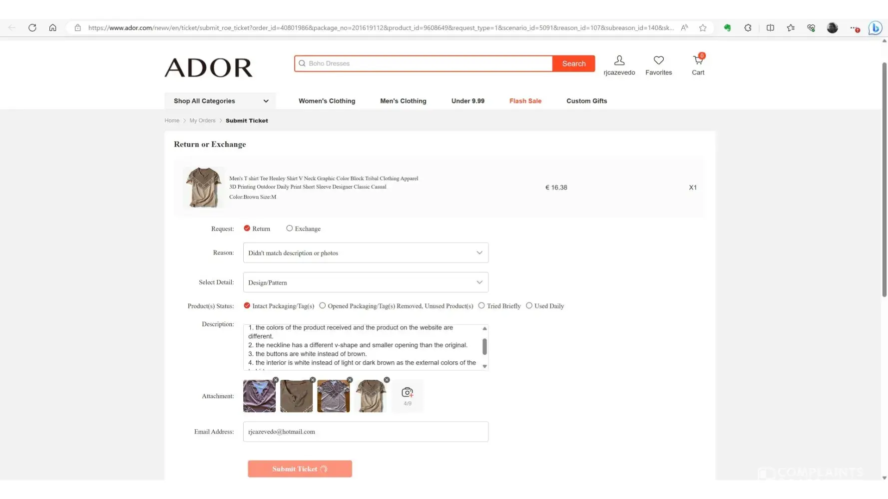 Inadequate Return and Refund System: Attempting to initiate a return or refund on their webpage proves to be a frustrating experience, as the process appears nonfunctional. Even reaching out via email to 'services@ador.com' leads to an automated response, directing users back to the same unproductive ticket submission page.
