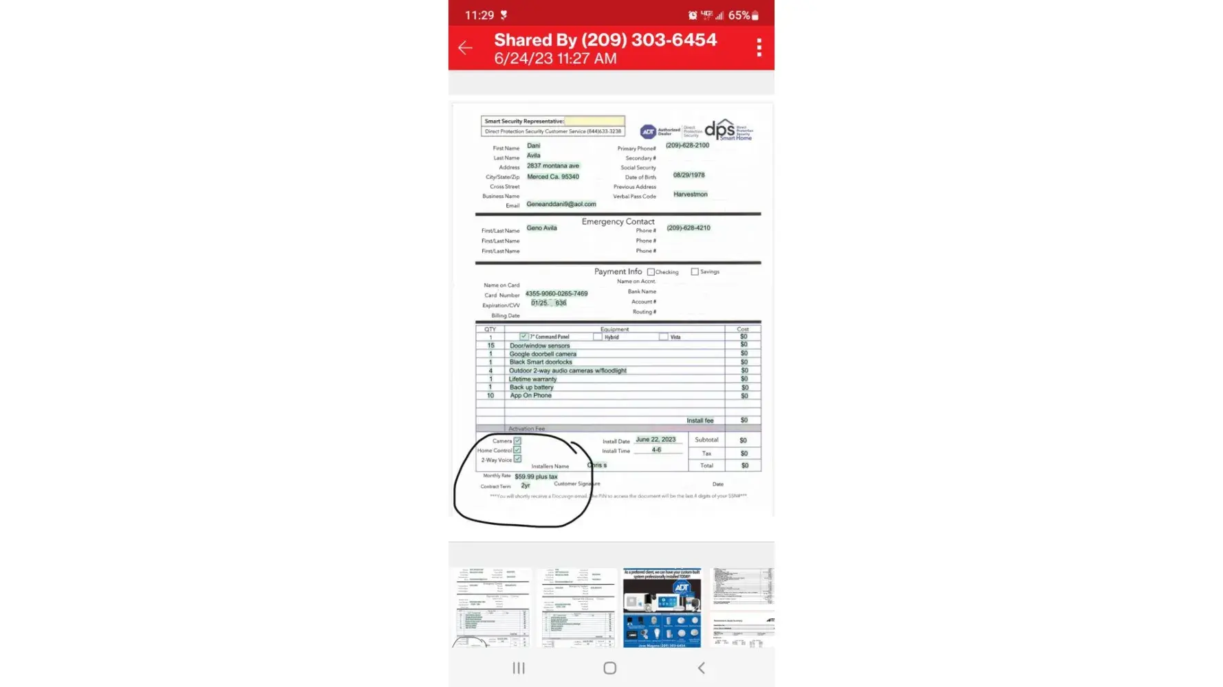 Restoring installation after 1 mth (Misinformation on recorded call) was never told about a cost for the touch screen after having the old panel for 26 yrs P/One & Adt for 12 yrs, Always paid 3 mths payment, got cost reduce to $39,87 mthly instead of $45? was told only to pay $12 (One time use c/c) for installation (Had all 15 windows/ 6 doors 2 smoke Alarms wireless or hard wired, 4 motion dectators all working w/ own equipment (See 10/19/22 equip requested except for 1smoke alm, 3 extra sensors, apart of package) Computer unable to hand sign contract, was not informedany extra cost of other installed equipment until Dec, c/c had $56 charged on 10/19/22 instead of $12. C/c used every mth w/o permission for equip & payments (Never told of paying for equip $725 or 5 yrs contract for 16.70. I request to Make sure only that 3 mths payment cycle be restored paying several mths in advance as in previous 13 + yrs. Did not sign or agree to contracts for equip, but decided to pay off equip for $725,00 but no one showed or email new amount until 4/27/23 never signed or agreed to it, Signature electronically displayed.