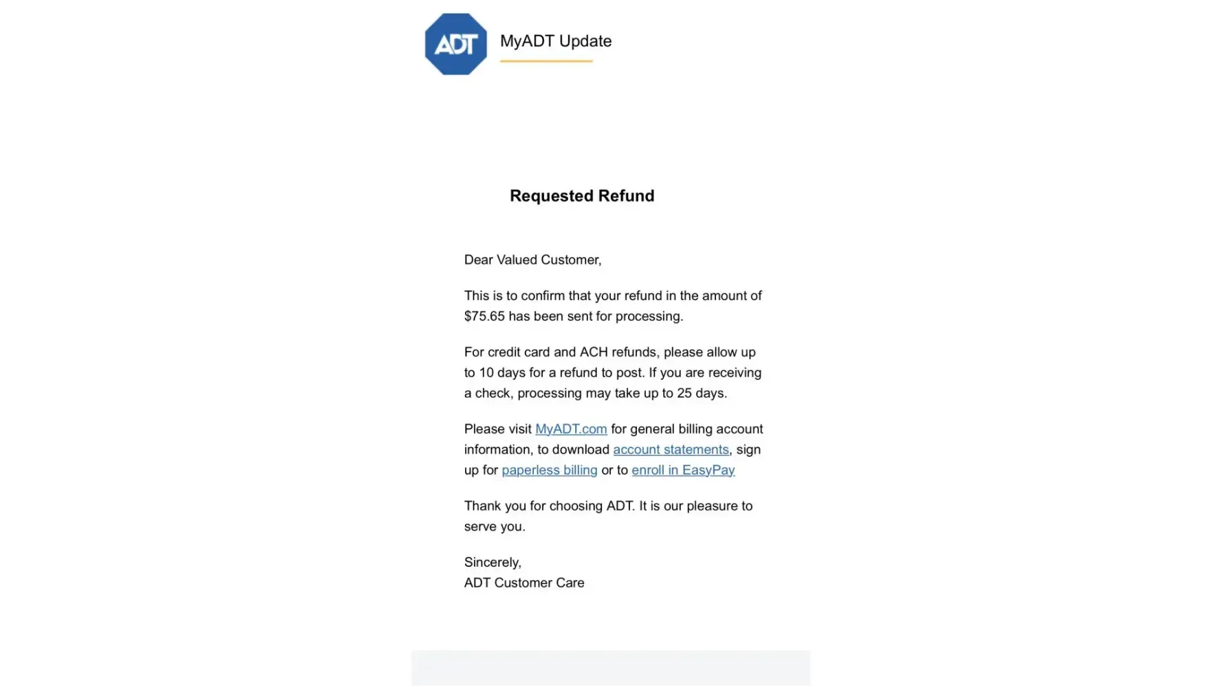 I cancelled my service with ADT & agreed to pay out my contract(2019). I set it on automatic with ADT so that I wouldn't miss a payment with them. Well, when the contract was finished - even though they were not monitoring my home - ADT continued to charge my account - for 2 years! I brought this to their attention - even with the cancellation in my records - they denied my refund request. ADT took over $1000.00 for services that they did not provide. I am so disgusted. I will never recommend them - they are not an honest company.