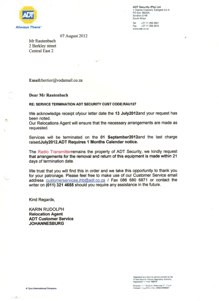 The service was cancelled by me in august. 1 month notice was given and I received a cancelation letter for the company. They said that they will come and take the transmitter. Till today after many calls to adt they still did not come and take it out. I am a pensioner and still they stole the mone form my account and did not repay it. I am going to sell the transmitter to make up my losses. The are a ### company with no service delivery.