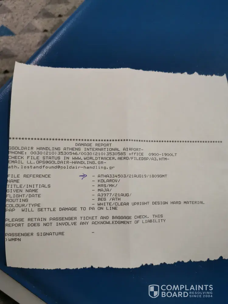 I arrived to Athens on 21. August, flight number A3977 and my bag was broken. The ground staff at Lost and found counter filled up damage report for me. I submitted it along with the all other documents they asked me for.