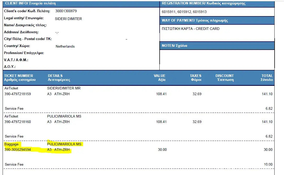 I am reaching out to you regarding an issue I faced in the airport. Although I had booked and paid a luggage when I booked my ticket, I was also charged in the airport because the desk there claimed that my baggage reservation was not evident in my ticket. As you can see in my invoice and boarding pass, I had booked two aegean class types of tickets and additionally a big luggage. In total, these would mean that we were allowed two hand luggages (as part of the tickets) and one big luggage which was paid. These were also the luggage that we had. Could you please let me know why I was asked to pay 80E extra in the airport?