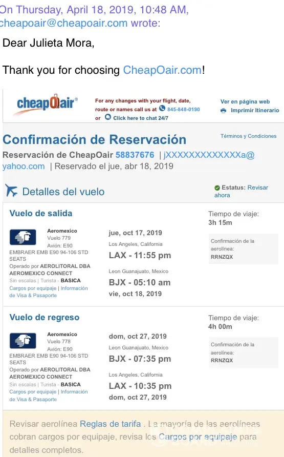 Aereomexico servicio al cliente me notificó que cheapoair el 18 de septiempre 2019 aceptó por medio de su servidor de vuelo y sin mi consentimiento el cambio de horario de ese vuelo, lo cual yo como cliente les notifique el 17 de septiembre a aereomexico y cheapoair que sino era directo mi vuelo yo no lo aceptaba (ya que mi destino de origen es slp y siempre busco vuelos directos y con horarios de dÃa para transportarme a la central de autobúses que me lleven a mi ciudad de origen san luis potosÃ, méxico)