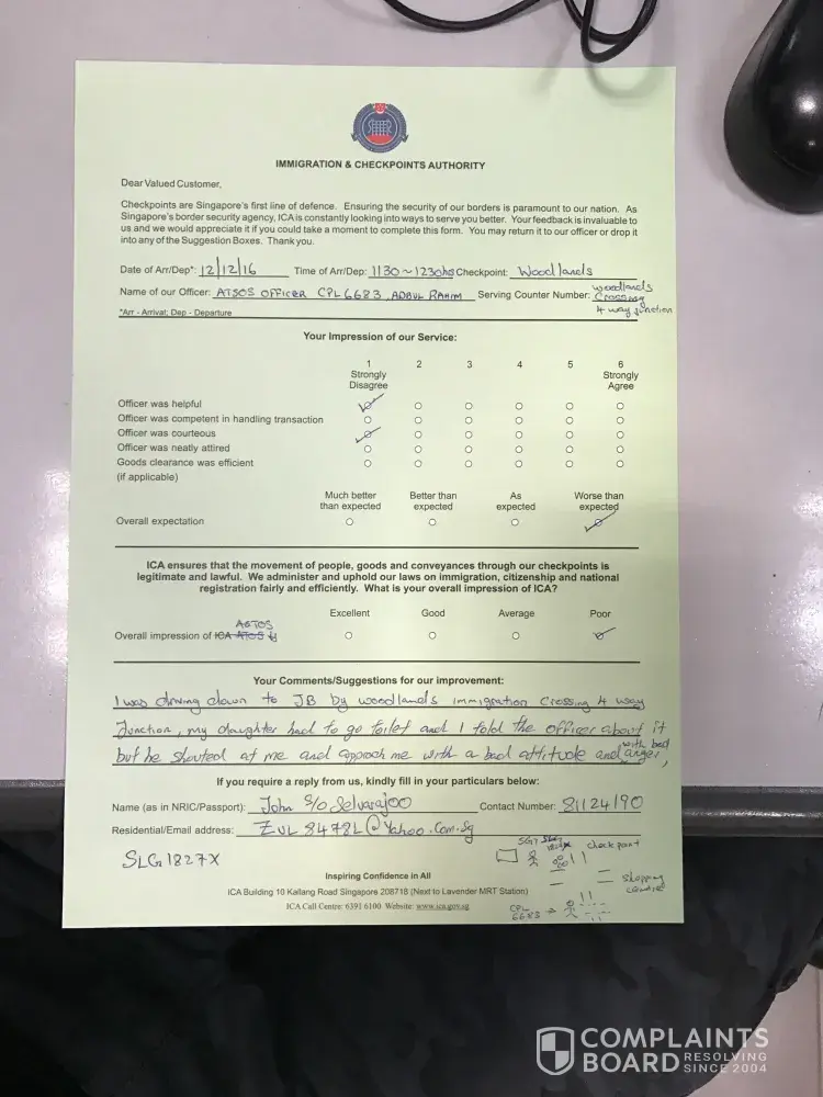 Good day in charge, on 13/03/17 around 1230am at woodland custom motorcycle passport scanning counter from Malaysia towards singapore. The machine failed on me after me and my girlfriend scanned our passport . We look around to for any buttons to request for help but to no avail, I ask my girlfriend to go to the office located in front to request for help. One malay officer around the age of 50 came out and then my girlfriend told him that we're experiencing some difficulty at our Lane. Number 33. He first question why is my girlfriend here with a very stinky attitude and ask her to lead her to our counter. After the officer came, he first lashing out at me saying why do I ask my girlfriend to walk over there and ask for help! Then he told me it's common sense that when the lanes is faulty. We should change to other Lane automatically and by passing the counter it's a offense. I replied him and say we got no idea that it's a offense and we sure can't find a alternate way. He's taking the conversation like a father scolding the son kind of attitude when we're merely asking for help. Then he asked us to wait there for around 10min when he go back to his office and proceed with idk what's he's doing. After that he came back and asked me for out passport and keys and ask us to wait outside the office. He then proceed with his job while I'm waiting outside. When I'm waiting outside and he's out to help other people with the lanes, he came towards me and ask me why am i staring at him sounding like a gangster. He repeatedly asked me if I have any question for him just because I'm spacing out and happen to look at him while he's working. I kept answering no. I don't have any question for him and he began to argue why am I staring at him all. This only end when a younger office came out and stop. After a while they ask me for my finger print and return me my passport at the office. So after I receive the passport. I politely asked through malay officer if I'm cleared to go. He gave me reply saying" stop asking stupid question. Use some common sense la. They already return your passport. " after that I asked him for his name as I wanted to made a report and he begin to question me for my rights saying like I don't have the rights to ask him for his name and then kept avoiding the question. Then I turn to ask the younger officer if there anyway to lodge a report. He refer me to block b and after that I left with no names of the officer and made a complaint at the office. Why am I receiving this kind of gangster attitude from a officer at my own dear country? This is really too much for a senior officer to behave and talk this way to a civilian and acted like a hooligan. I am waiting for your reply. Thankyou.