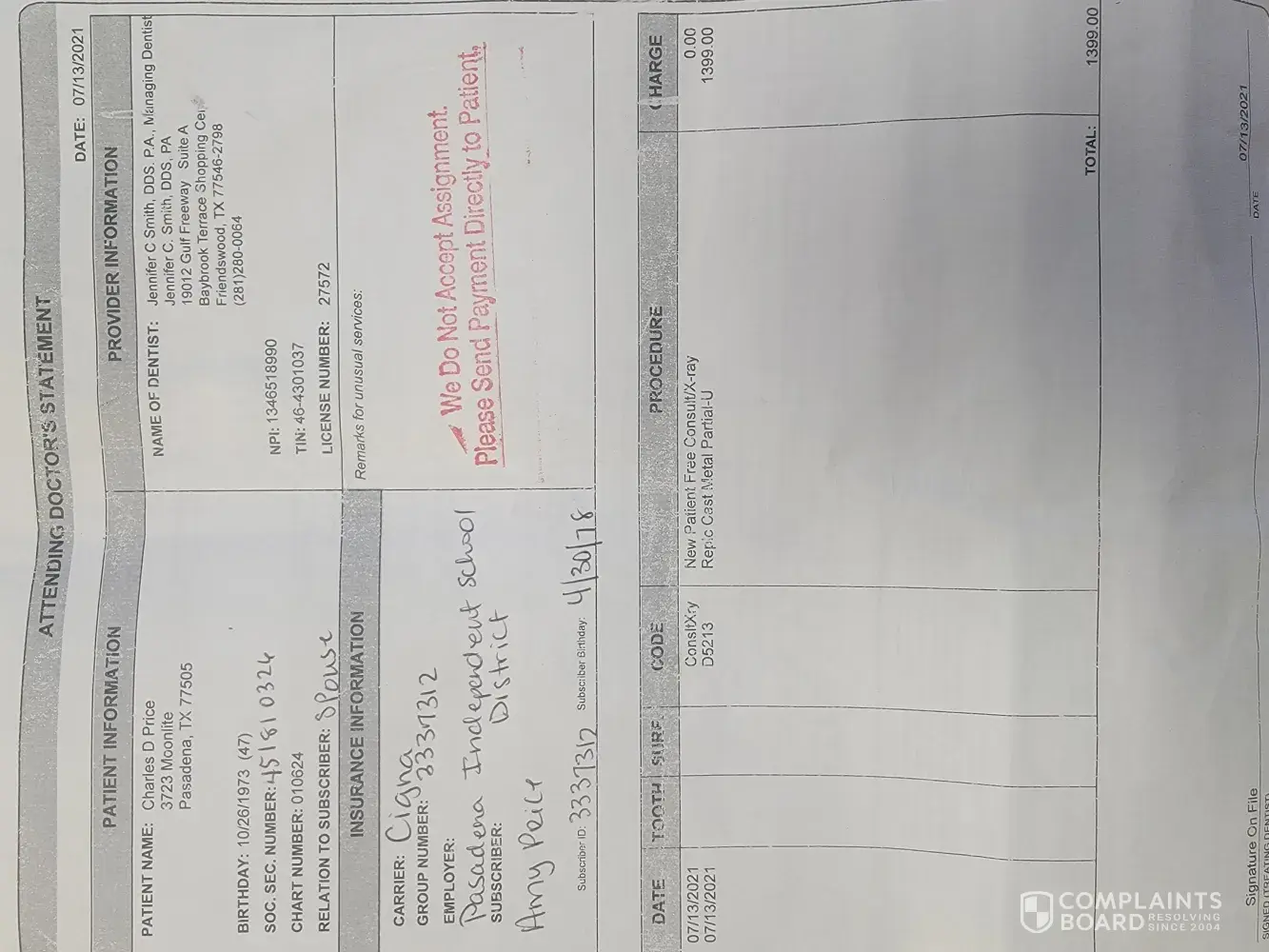 On July 13, 2021, my husband went into the Friendswood Texas office to get some help with his teeth. We purchased the metal cast partials for 1399.00. As of 12/13/2021 we still have not gotten his implant the first set was broken by a worker trying to fit them correctly for my husband so we started over and we are still waiting. 5 months we have been waiting and we still have not got what we paid for. I would some kind of compensation for the amount we paid as it has taken so long and we even had to go on our 25th-anniversary cruise with my husband not having his partials which inhibited his ability to eat and enjoy the trip. This is very poor service as we were made to pay up front for something that has taken almost half a year to get.