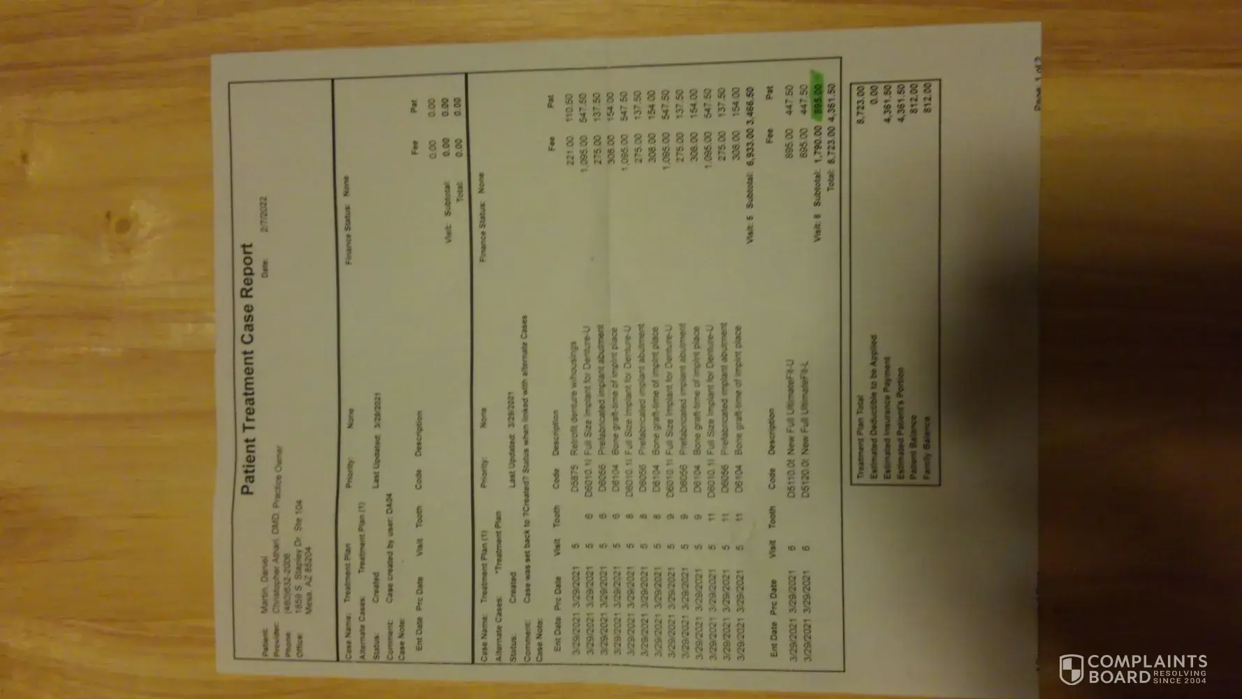 In the middle of this procedure the office staff entered the treating room and began to tell me I owed 1700$ at that appointment. I first explained that I had already covered this in my last visit and I had the print-out that had summarized my remaining care and the cost had been given as 895.00. I was told this was incorrect, I was mistaken or must have misunderstood, by this staff person and the office mgr. as well. In addition I was told this could not be for upper and lower dentures. Please see attached document, Patentint Treatment Case Report dated 02-07-2022 form your office. In this document from your occie it clearly indicated the remainder left to pay is $895.00 and that it is for upper and lower dentures.