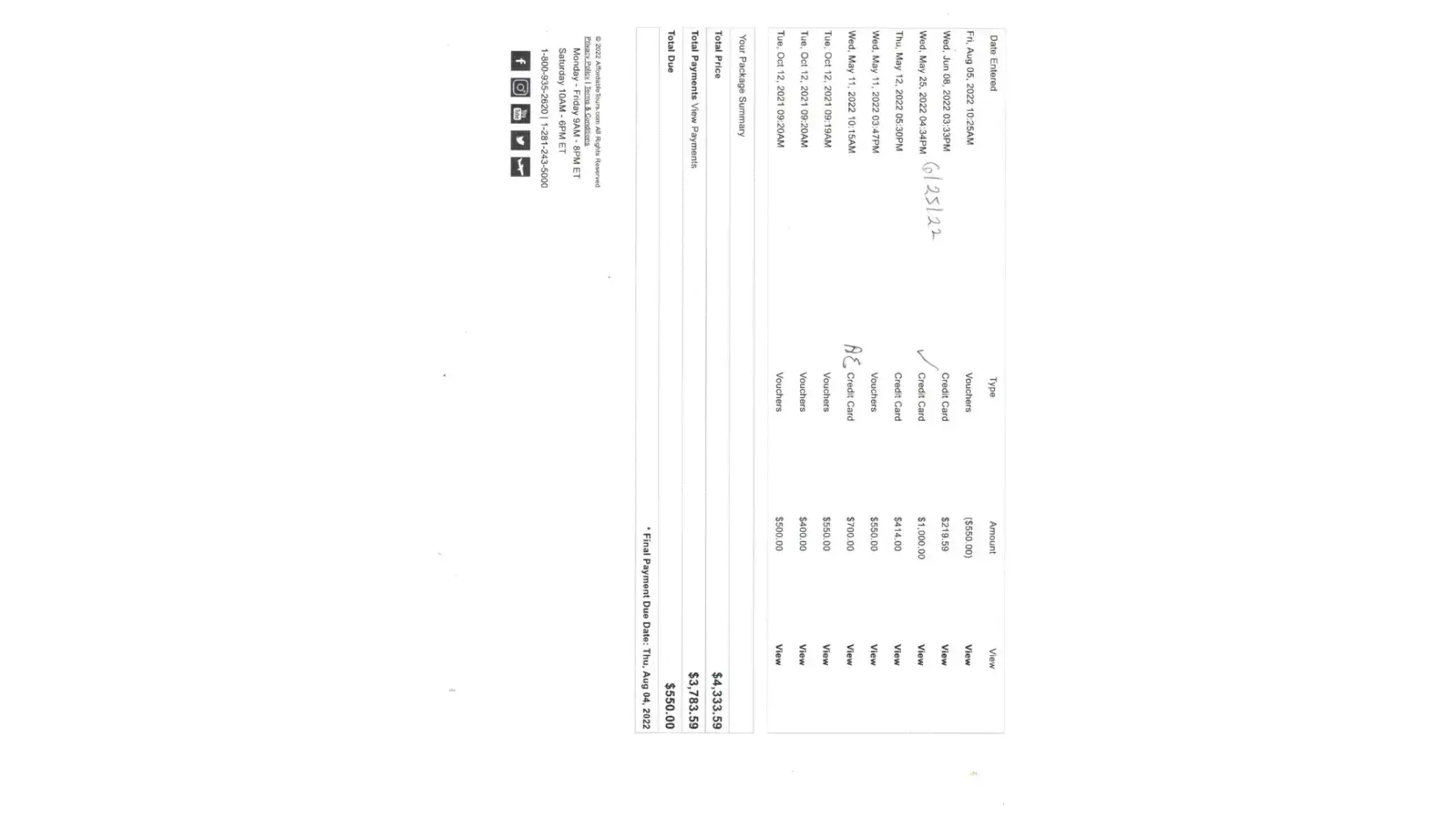 Be careful when booking with Affordable Tours. The discounts that they claim to get for you is less than what you can get from the actual tour company. Allso the booking payment confirmation email does not state that you will be penalized 5 % if you pay the amount with a credit card . Other tour companies will clearly state that payment with cash or check will merit you a 5% discount. While booking to get the sale the agent will tell you that you will get a further discount from the booking price if you pay by cash or check.When I tried to pay the final booking price payment on my confirmation statement the 5 % credit card penalty was added onto my final payment and I was forced to pay it since I was paying by credit card.