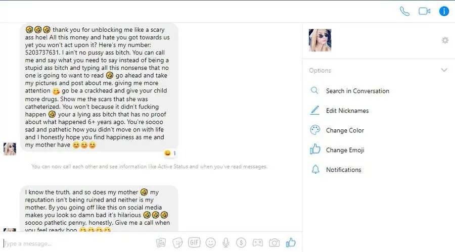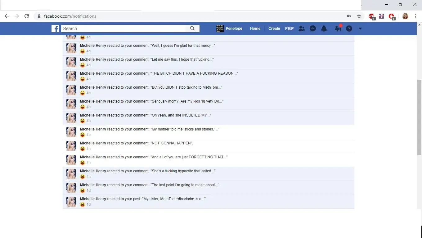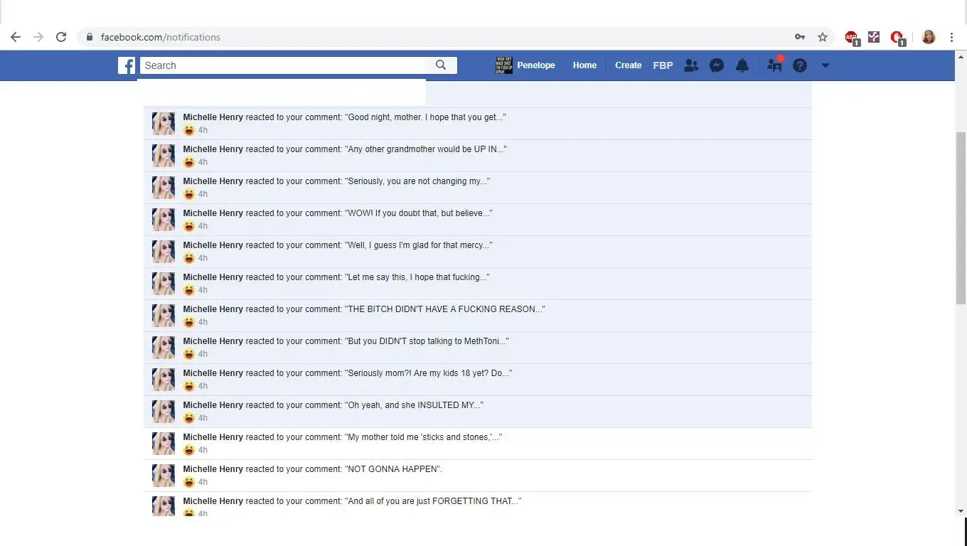 This event took place on September 5th in the early afternoon around 5 PM. Michelle Henry, your 'social media' employee is not my friend on facebook, and we have no mutual connections. Somehow she found and targeted my page for harassment. She found a memory that I had shared of a traumatic event in my life and started posting the laughing emoticon on it...