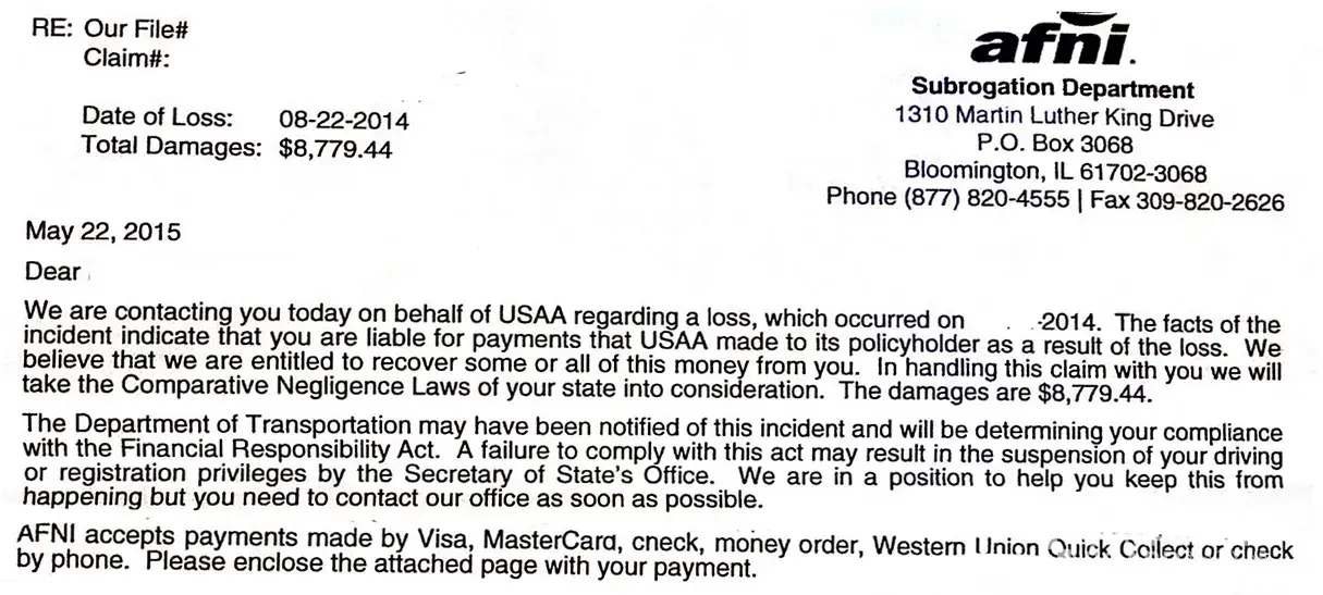 I just received a letter from afni inc, stating i owe them $8, 779. 44. For a loss and damages. . They threatened me by saying they will take the comparative negligence laws, and that the department of transportation told them that mt license will be suspended and registration, if i do not pay immediately. . They told me to make payment by visa, mastercard...