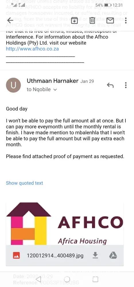 Proof of payment sent and date was discussed. Why was I not informed further if anything was needed instead of threats of lock down.
