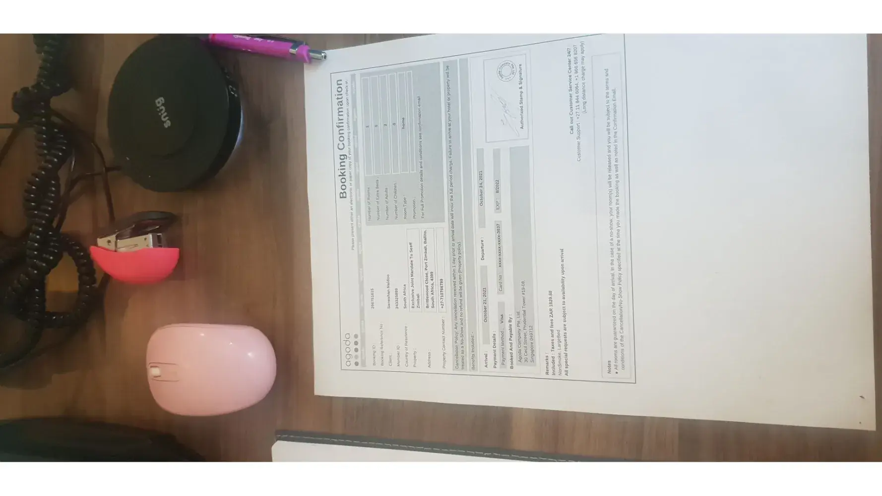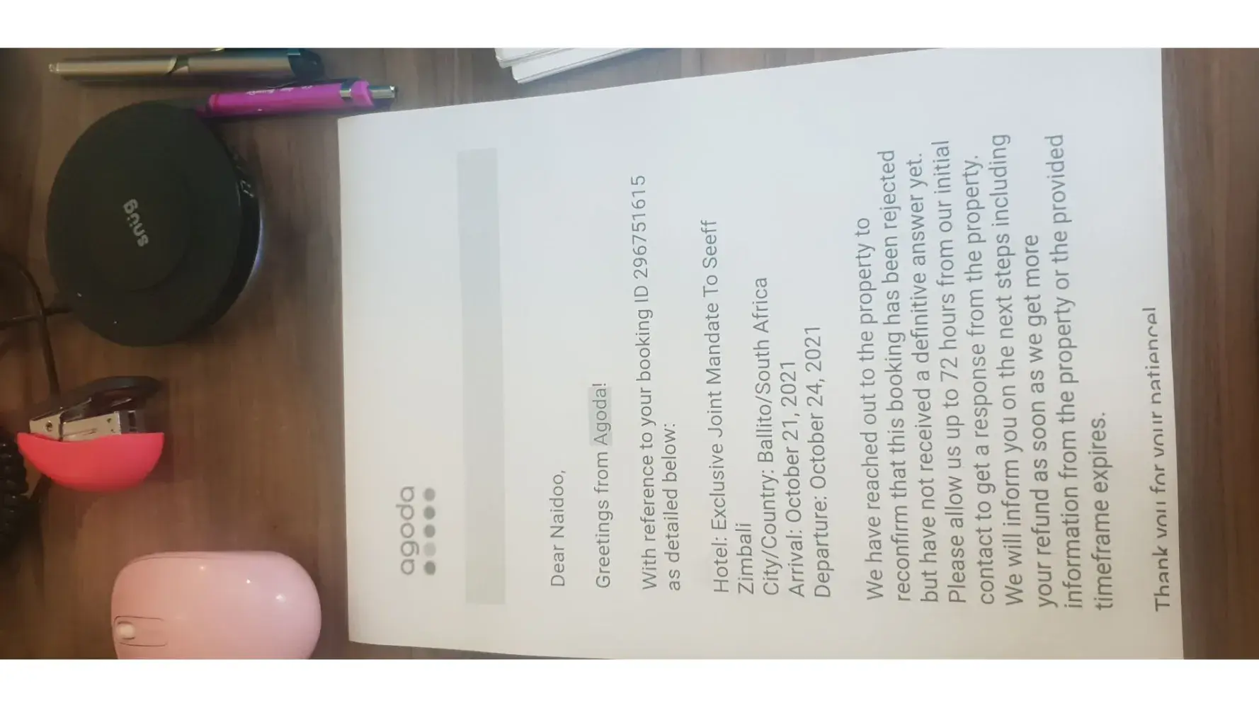 requesting us to pay another amount as a security deposit. This was paid to the banking details supplied. All confirmed documents were received, and we were looking forward to a good restful break. When we arrived at our destination on the 21.10.2021 we were told that there was no booking under this reference number, and we were scammed. The property that we had paid for doesn't even exist. You can imagine that we were disappointed and upset as this is alot of money that we had spent. We did have to try and find another place as we had family with us and had nowhere to go. We tried contacting Agoda numerous times and were promised a refund but to date none was received. We had called and the advisor said they will get back to us but that never happened. We feel that it was agoda's responsibility to get back to us as we paid for something that we never used. All documents are attached for referral purposes, and I hope that Agoda takes my case very seriously.