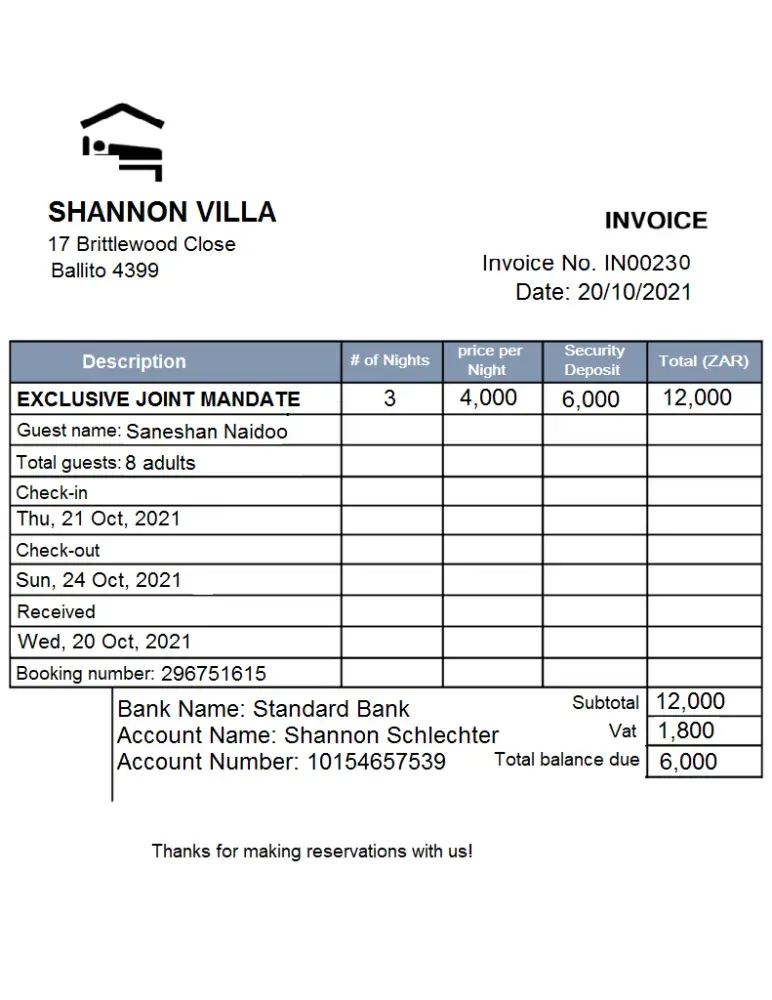 The booking was done and paid online with a credit card. All booking confirmations was received and we got another invoice from Shannon Villa