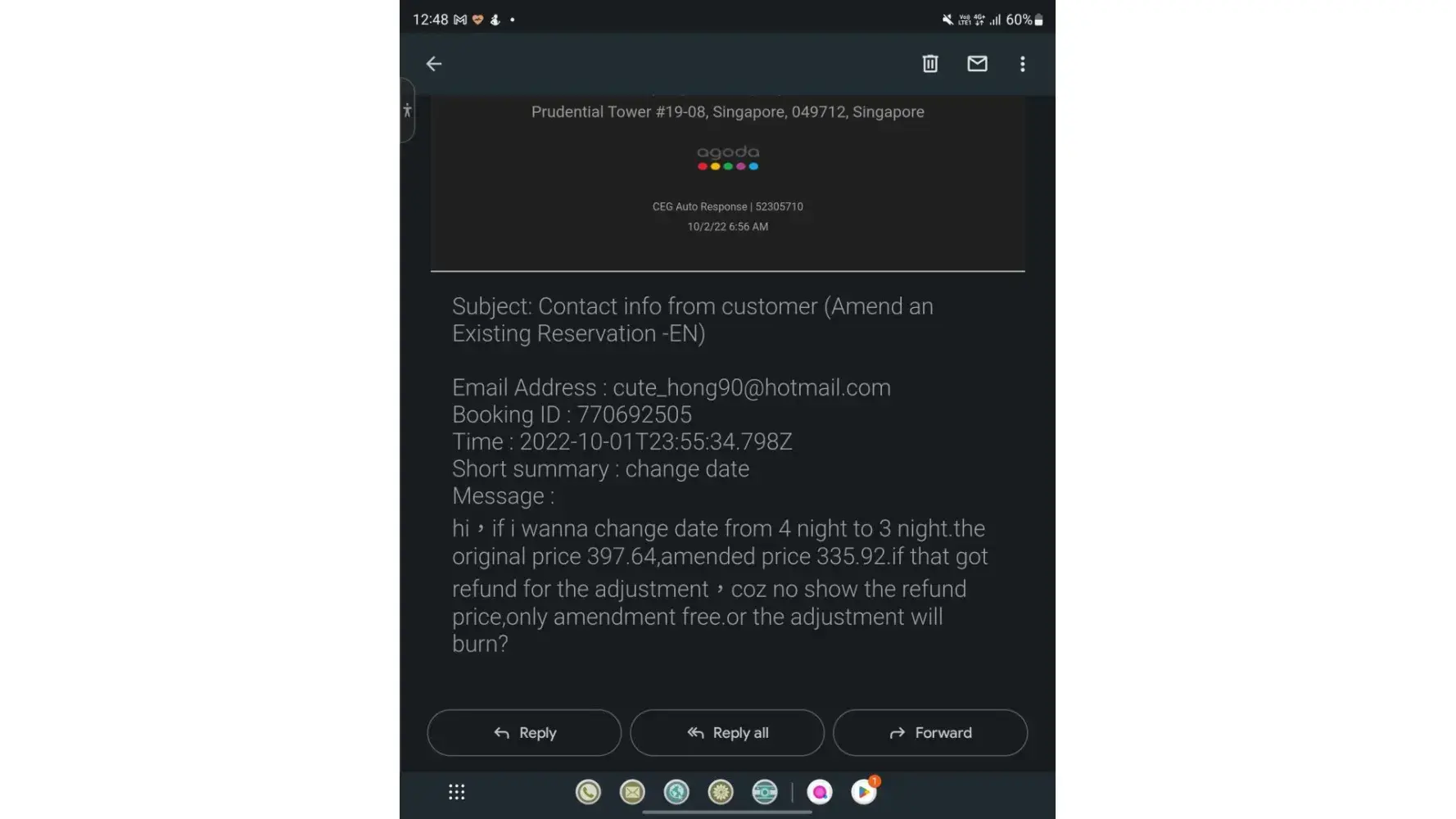 Saya membuat tempahan PADA 30/09/2022 melalui apps Agoda. saya dgn tidak sengaja tersalah pilih tarikh tempahan ( paid RM275.03), Dan segera memaklumkan pihak Agoda selang 5min temphn dibuat untuk penukaran tarikh. Malangnya, keesokan harinya saya menunggu 6 jam d luar hotel tetapi pihak Agoda hanya kata ' no response from third party' wal hal pihak hotel membolehkan untuk tukar tarikh. Duit saya RM275.03 lesap (RUGI) begitu Saja. Saya ingin duit saya semula!.