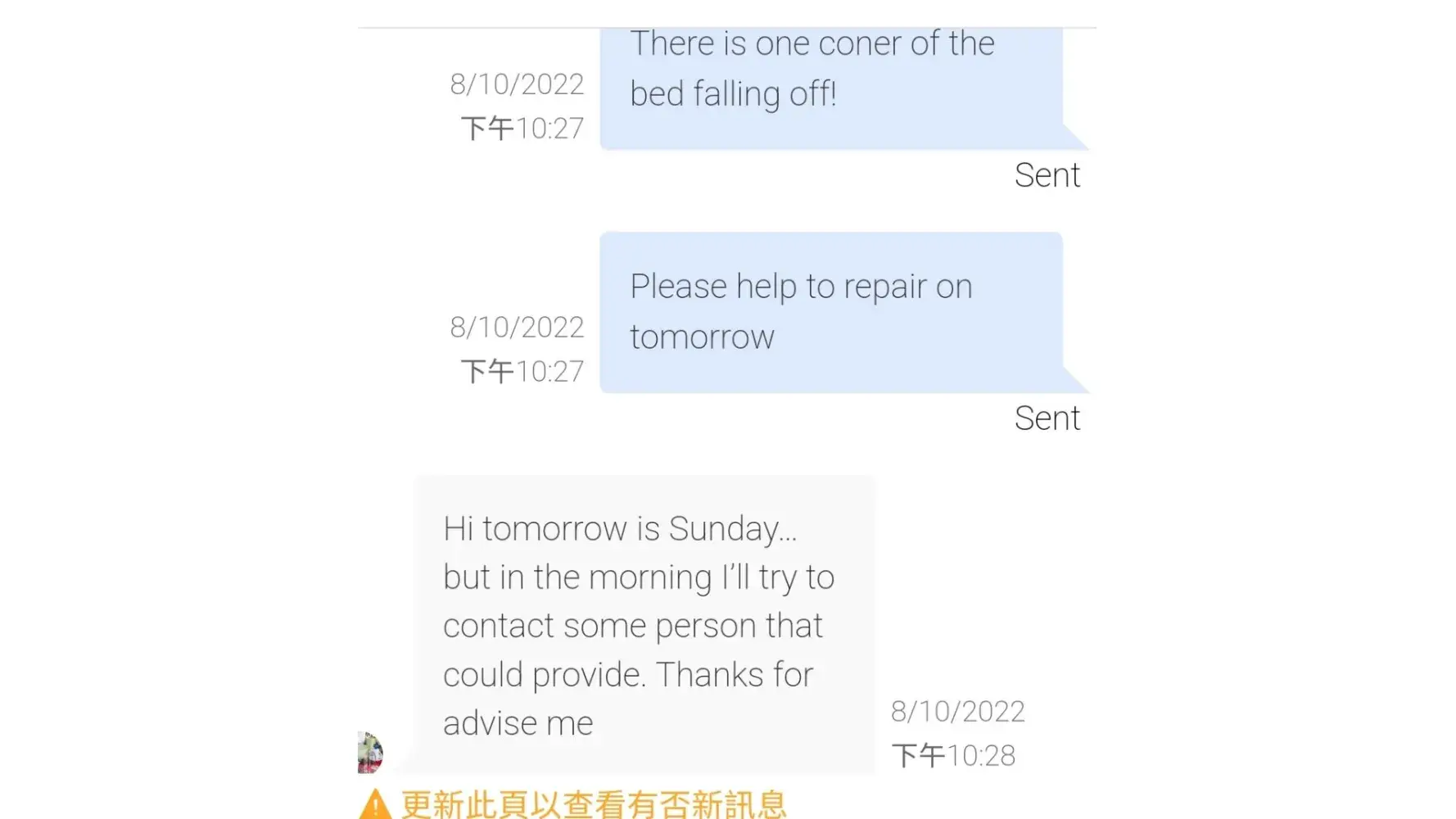 The bed have one coner fall off. And I have complaint to the guess house. The reply is there is nobody to repair due to Sunday.