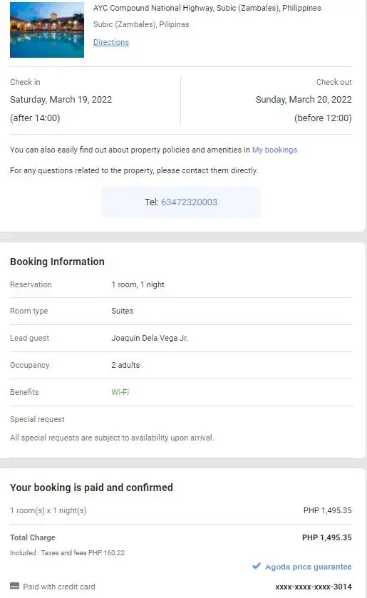 As this booking - [protected] had gone through, Subic Waterfront Resort & Hotel had called me to advise that the room is no longer available on the specific date.