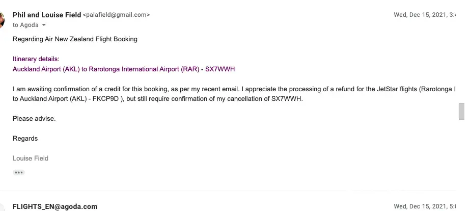 I have contacted AGODA numerous times abut arranging either a refund or a credit for this flight. The outbound flight to Rarotonga was cancelled due to Jet Star removing their service, so the Air New Zealand flight I had to book myself has already been credited to my Air New Zealand account.