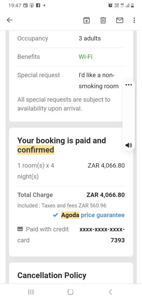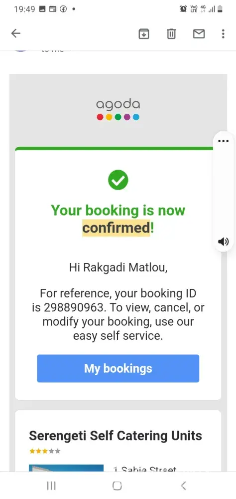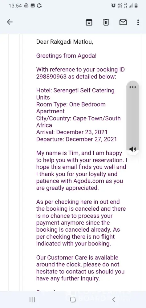 I booked a room at Sunbird Nkopola Lodge in Malawi on 28th Dec 2021. When I got there there was no reservation under my name. In fact the hotel says that they have no partnership with Agoda and that this week alone they have had a number of people returned.