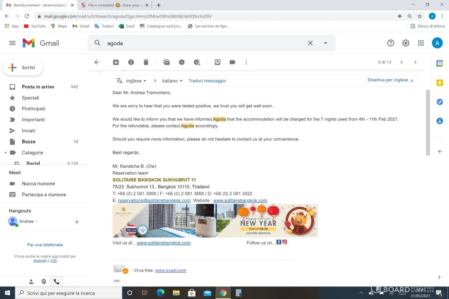 I'm waiting for the reimboursement about the booking n. [protected] (Solitaire Bangkok Sukhumvit 11).
