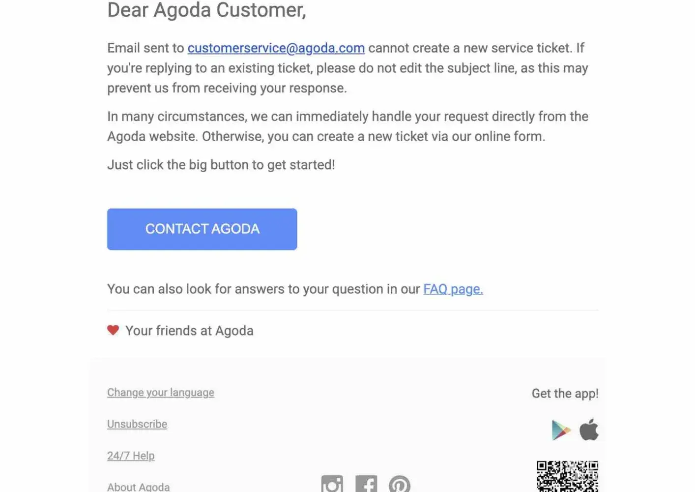 I could not contact AGODA via email to complain as we had an Internet connection problem at the company, I was at the time.