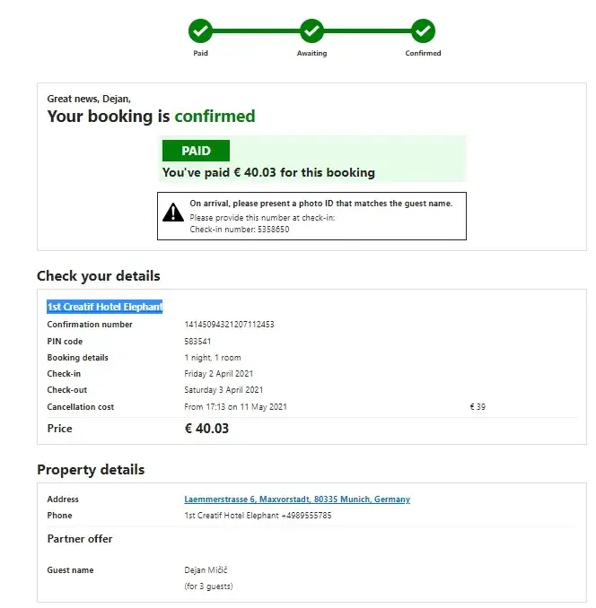 Here attached the screenshot of the email by the hotel, announcing the remboursement.