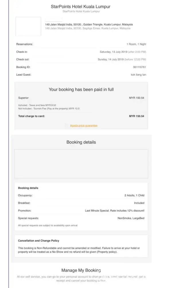 We make the full payment booking the hotel on the website www.agoda.com date is 13th July 19 - 14 July 19 StarPoints Hotel Kuala Lumpur. In the morning 12th July 19 we request change the hotel date to 20th July 20 - 21th July 19 talking by phone. The customer services person say will help us change the hotel date to 20-21th July 19. On 15th July 19 we received the email inform can't change the hotel booking date for us. Why over the date for check in only inform us then without any replacement directly cancel our booking unreasonable. If agoda customer services person incharge inform early the hotel date can't change we will stay in the hotel on the same day. We can't accept unreasonable cancel the hotel booking without replacement or refund and late notify.