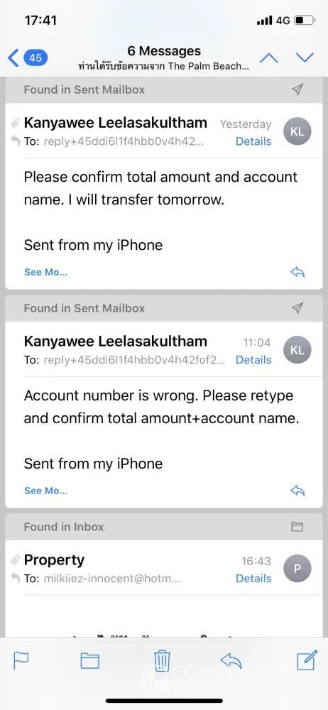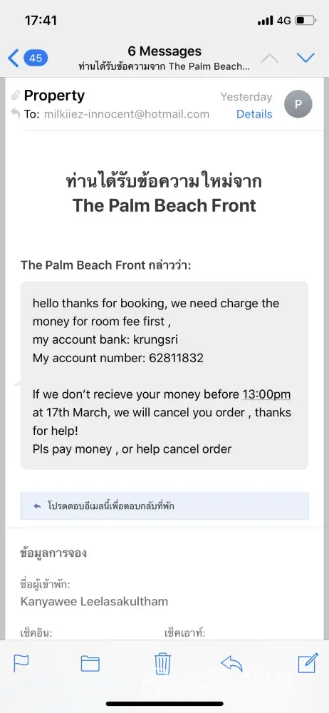Yesterday 16 Mar, I got email from an owner room at this condo she wants me to pay within 13.00 on 17 Mar. I found account number is wrong. I cannot transfer to hers.