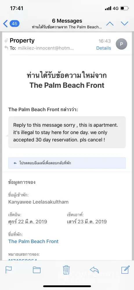 I have booked 1 room to check in on 22 Mar 2019 at The palm beach front. I received booking confirmation and booking number by email since 28 Feb 2019 from Agoda under [protected] .