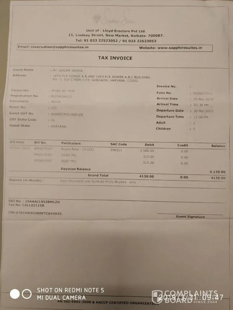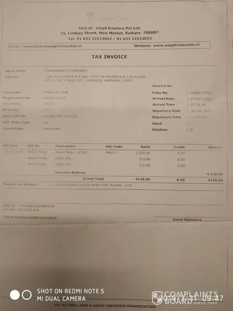 Please be informed that I had to pay Hotel bill of Rs. [protected].04 USD) inspite of advance booking through online service & I also had to face additional hassle for booking cancellation from your side. As you are a reputed online booking service-provider hence this was really unexpected to observe such poor agreement facility with the Hotel authority.). So I claim for equivalent financial compensation against this mismanagement conducted by you.