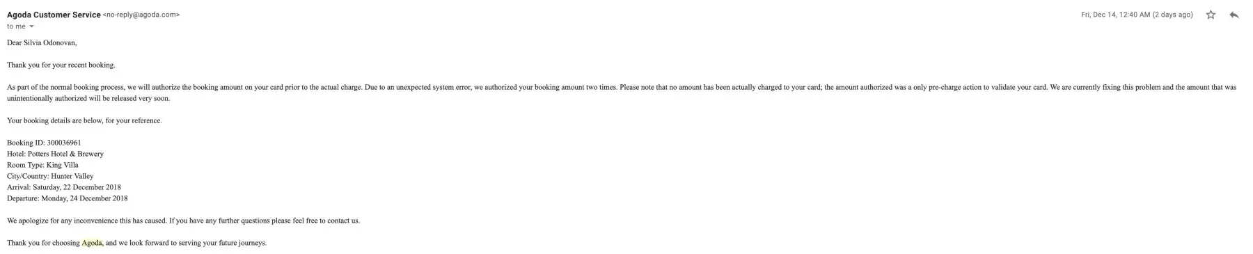 I made a hotel booking (Potters Brewery in Hunster Valley, NSW, Australia) via Agoda in september and on the 14/12 they've authorised the same amount by mistake twice.