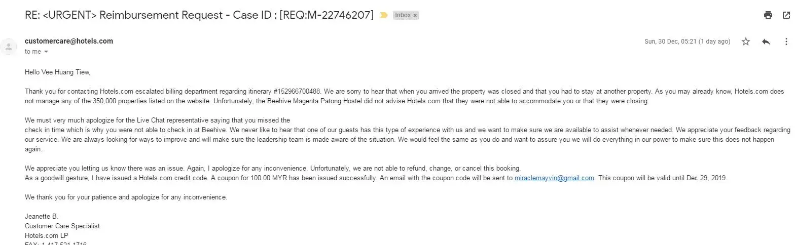 Agoda went silent again. On 30 October 2018, I sent another remind to Agoda and have not heard from them since.