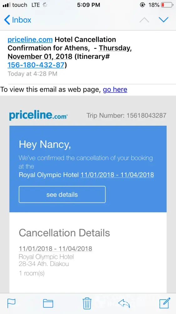 I did a reservation online at royal olympic hotel athens through priceline few hours ago and for some reasons I canceled the booking after that. But I found out that the money was transacted! The hotel says the cancelation was successful and they did not charge me. AI called priceline and they said that my reservation was done through you and you are responsible of that. Please I need my money back to my account.