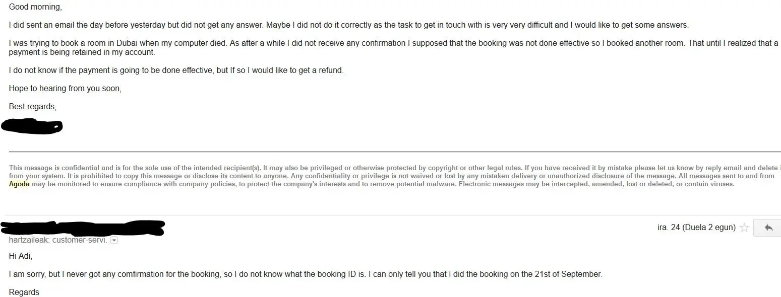 I was making a last minute reservation for Dubai while I was waiting for boarding into the plane when my computer run out of battery. I got into the plane thinking the booking was not fulfilled, until when arrived to the destination I realized that Agoda made a charge on my bank account.