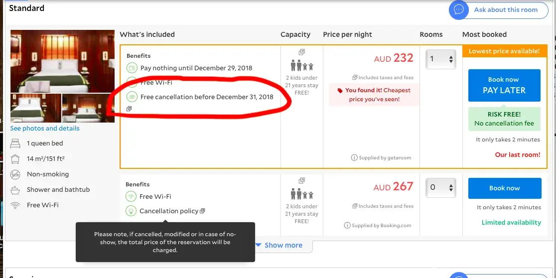 We have several screenshots from your website that clearly state 'free cancellation' and 'risk free booking'.