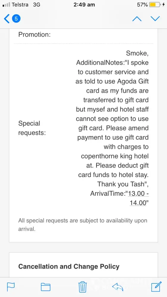 All issues were resolved by customer/booking dept at the time of phone when I rang cancel booking and said to rebook which will allow me to add charges which had been charged to gift card with new booking, except his instruction to use gift card were incorrect so I included details when lodging new booking which was made immediately after speaking with CS see attached photos.