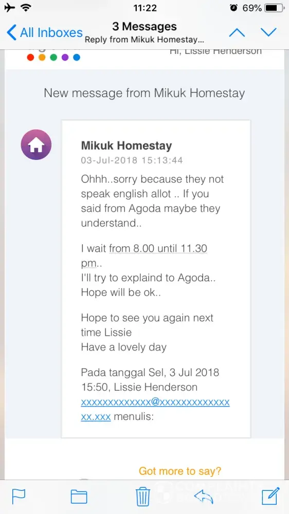 I booked an apartment for my family stay for 1 night stay at Butterworth, Penang Malaysia on 4th Aug 2018 from Agoda site. Apparently, the property didn't provide any contact or email for arrangement or question... I expected the owner at least contact me days before the stay, but owner didn't contact me until the date that we suppose to stay in the unit. He only wrote me an email on 4th Aug at 11am+ to ask for my contact for arrangement. I was not reachable (due to travel cross Hatyai Thailand) and was late for the check in time.
