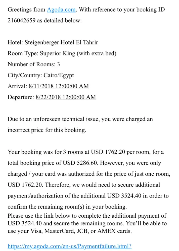 Your booking was for 3 rooms at USD 1762.20 per room, for a total booking price of USD 5286.60. However, you were only charged / your card was authorized for the price of just one room, USD 1762.20. Therefore, we would need to secure additional payment/authorization of the additional USD 3524.40 in order to confirm the remaining room(s) in your booking.