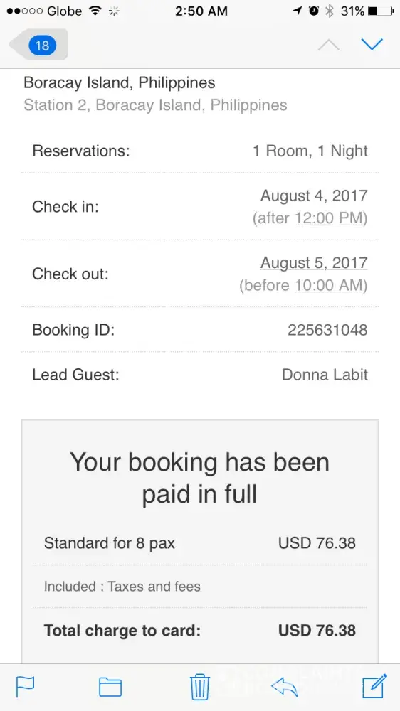 I booked a 2 night hotel at boracay Philippines see attached photos for booking confirmation and prof of the complaint. I got bitten by some insects by my left leg since that 1st night and after putting some cream last 04-06 Aug thinking will go away, unfortunately until this moment I'm still suffering with all of this itch and irritating bites.if you have further question please feel free to contact me anne time at [protected]
