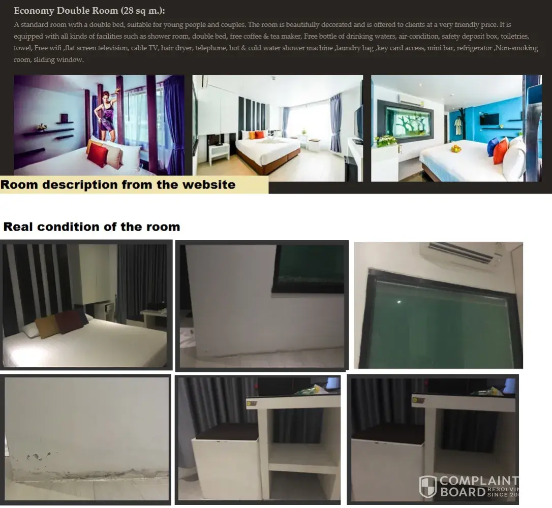 I have attached 4 images ( 3 real photos taken at the room that was given to me and 1 of the advertised). As you can see there is a big difference in room quality between the advertised compare with the actual real room space.
