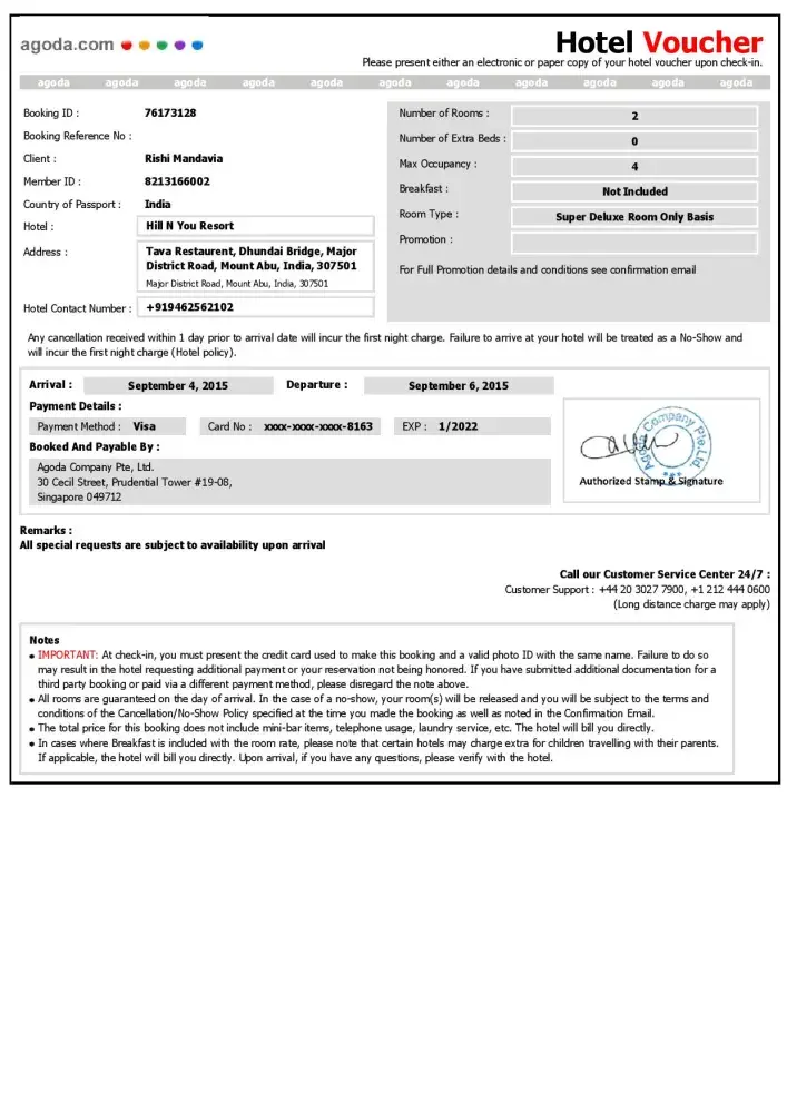 I have booked hill n you (mount abu) from agoda with booking id no - [protected], we went there 4th sept, I reconfirmed it twice with hotel if there is any issue because I was going there on vacation with my 4 month old baby for first time so I wanted to make sure there ain't any problem and when I reached there they said we have a problem with your reservation agoda.com so we wont give you any room.