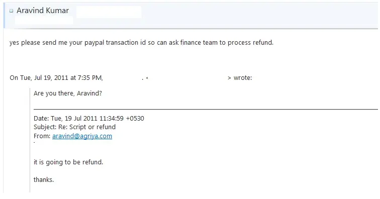 Angered that a vendor who I bought software from (Agriya) would breach my trust like this, I demanded a full refund from Agriya since they could not be trusted nor could I feel secure using their software platform anymore. Aravind initially denied that Agriya mis-used my credit card. When I told him that I have bank statements to prove the unauthorized charges and that I had contacted the owners of the other websites, Aravind said he would look into it. Over 3 weeks passed and Aravind kept giving excuses that his staff was gone for weekend or holidays or that he has to ask Finance department about refund. Or that he had not heard back from the Finance department. He acted as if he has no authority to offer refund although he is listed as CTO of Agriya on LinkedIn. Aravind is also listed as CEO of Agriya on another company directory at Crunchbase.com. Come on, it's quite clear Aravind is running the show at Agriya. Yet, he continued to act as if he has no authority to refund the money. The guy treats you as if you are dumb.