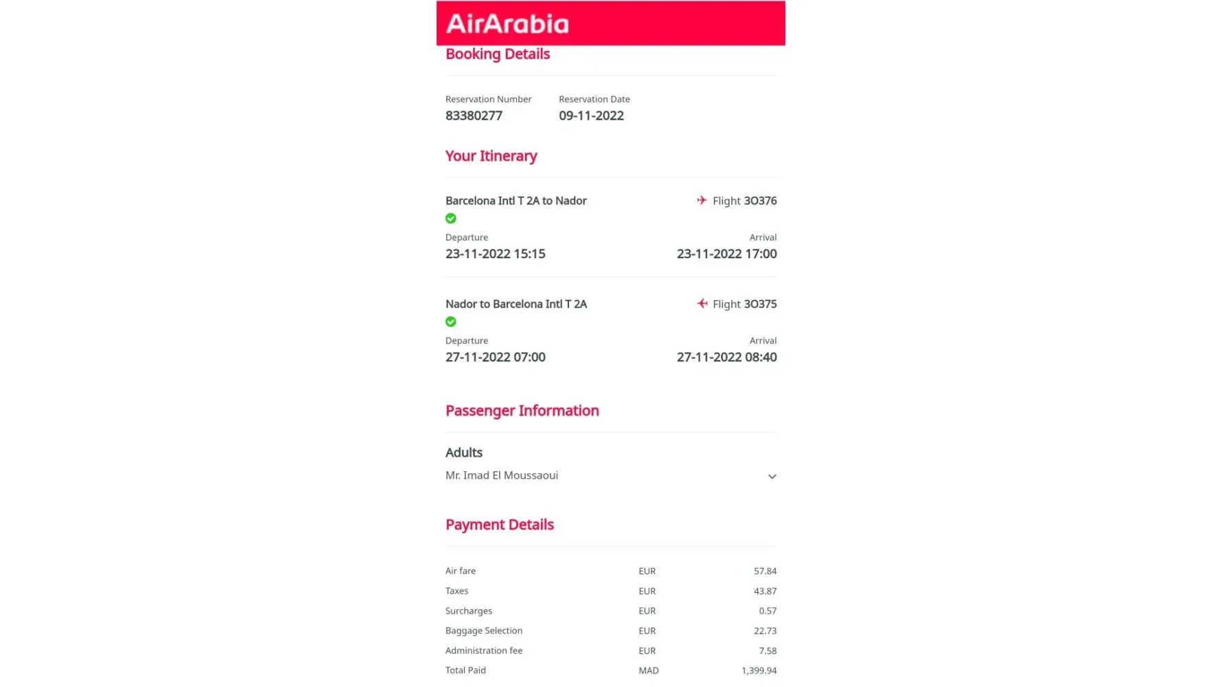 Name: Mark Fahey. Date: Saturday, May 31st Time: departure (Mohammed V Casablanca) 16.40 Flight: Air Arabia Maroc 437 from Casablanca, Morocco to Sabiha Gokcen Istanbul, Turkey PNR: CPUZFP Booking I.D. [protected] On booking, there was no facility to increase the weight so that the charges were transparent. At the airport, I was initially charged MAD 1200...