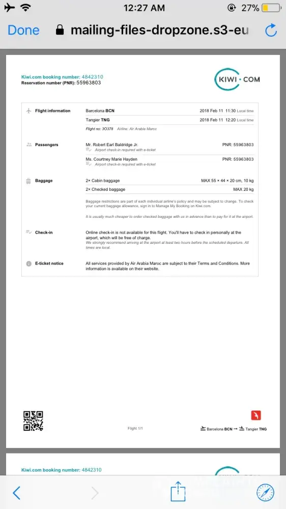 Today my wife and I were scheduled to fly from Barcelona, Spain (BCN) to Tangier, Morocco (TNG) at 11:30 AM Barcelona time. Our flight number was 3O 378 with Air Arabia Maroc. We booked this flight through www.Kiwi.com with a booking confirmation number of 4842310. Our reservation number was [protected].